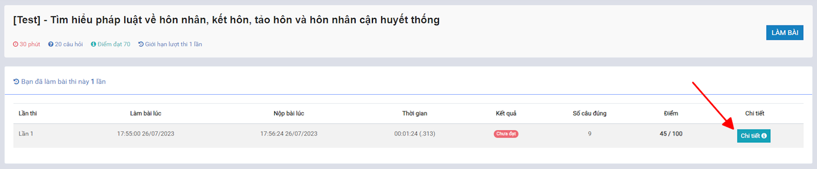 Sau khi đã làm bài xong, nhấn vào mục chi tiết để xem bài thi của mình.